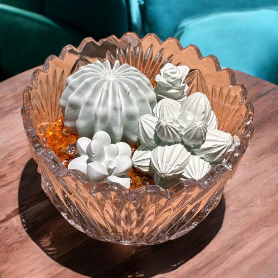 An adorable Aroma Stone succulent garden set in a crystal bowl with glass-bead "soil".