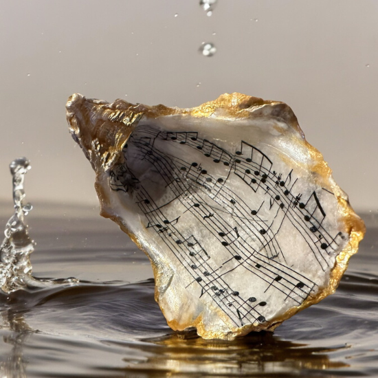 A beautiful, hand decorated and painted Loch Ryan oyster shell featuring a black and white sheet music design, finished with gold leaf. The back of the shell is also hand painted with liquid gold leaf.